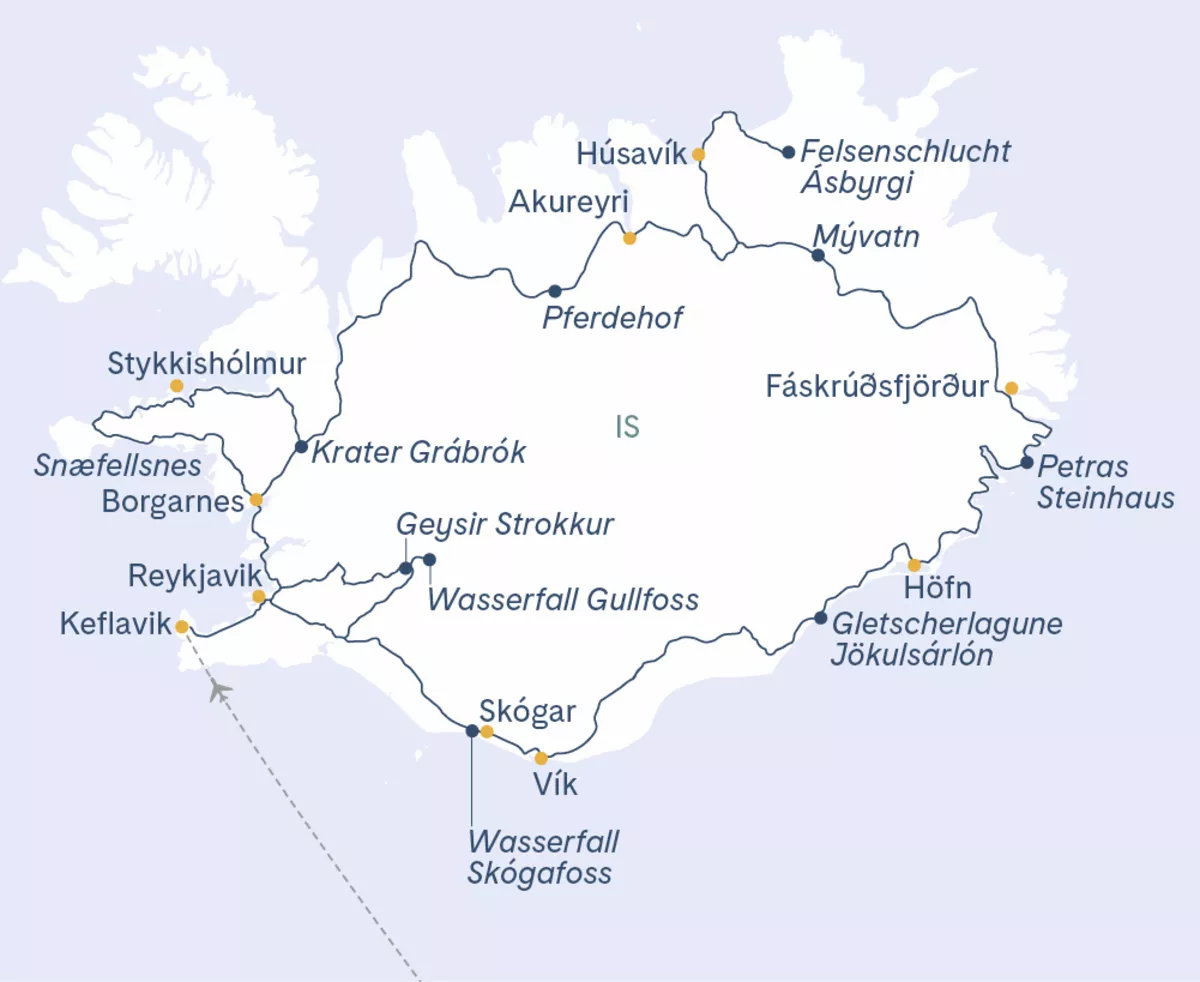 Am frühen Morgen werden Sie zum Flughafen von Keflavík gefahren, von wo aus Sie Ihre Heimreise antreten. Individuelle Rückreise ab Flughafen Zürich.