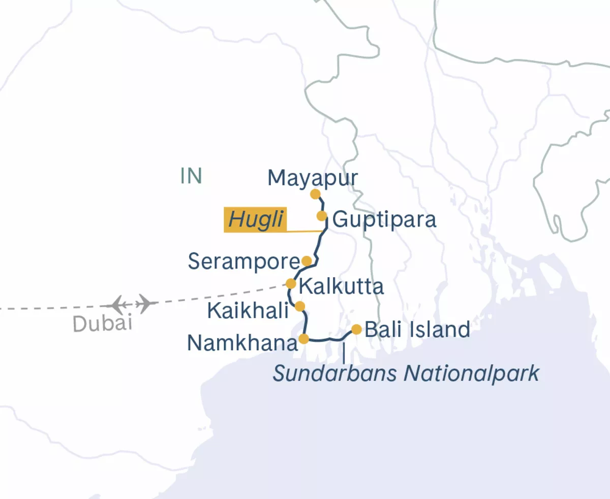 Stellen Sie sich vor, Sie erleben ein spannendes Abenteuer, das in der aufregenden Stadt Kalkutta beginnt. Von dort aus geht es weiter nach Namkhana, dem Tor zu den geheimnisvollen Sundarbans. Sie werden die einzigartige Natur dieser faszinierenden Mangrovenwälder entdecken. Auf Ihrer Reise besuchen Sie auch Mayapur, einen friedlichen Ort mit einer besonderen Atmosphäre, und Bandel, wo Sie beeindruckende Gebäude bestaunen können. Machen Sie sich bereit für eine unvergessliche Indien-Flussreise voller Entdeckungen.