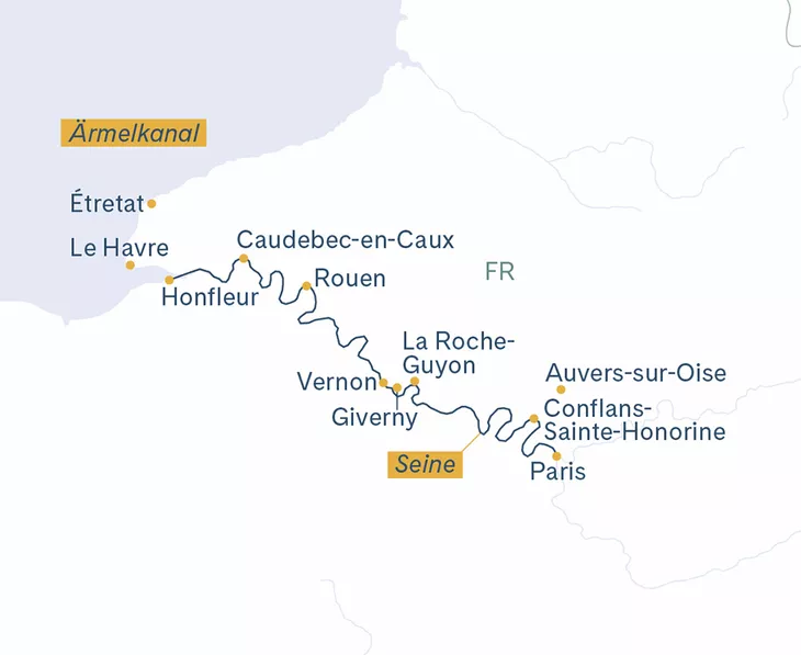 Flussfahrt von Paris an den Ärmelkanal mit Stopps in Rouen, Vernon, Caudebec und Conflans-Sainte-Honorine. Entdecken Sie auf dieser Seine-Flussreise die entzückende Künstlerstadt Honfleur, das Seebad Étretat mit den eindrucksvollen Kreidefelsen und Le Havre, die Hauptstadt der Normandie.