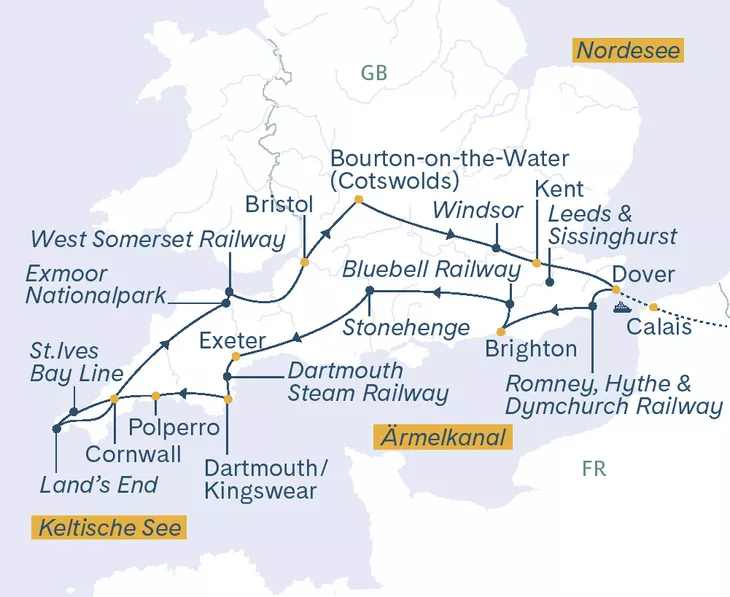 Auf dieser zauberhaften Erlebnisreise nehmen wir uns Zeit, Südenglands grossartigen Bilderbuchlandschaften aus verschiedenen Perspektiven und mit allen Sinnen zu entdecken. Historische Lokomotiven ziehen die liebevoll und mit viel Hingabe restaurierten Panoramawagen schnaufend und gemächlich durch die malerischen Landschaften. Unterwegs stossen wir auf Bahnhöfe, wo die Zeit stehen zu bleiben scheint – fantastisch. Wir flanieren durch hinreisende Küstenorte und bestaunen beeindruckende Schlösser mit Gärten, die zu den schönsten der Welt gehören! Kommen Sie mit auf eine Reise, die Sie begeistern wird!