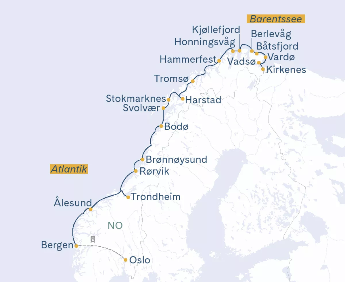 Bei der Fahrt auf der Küstenroute von Bergen nach Kirkenes und zurück nach Trondheim passieren Sie verschneite Fjorde vor stillen, kraftvollen Bergen in der verträumten Dunkelheit des Winters. In dieser Jahreszeit erwartet Sie eine besondere Stimmung: klare, frostige Tage, leise fallender Schnee und lange Nächte, in denen am Himmel oft geheimnisvolle Polarlichter tanzen. Entlang der Küste schmiegen sich urige Fischerdörfer zwischen vereiste Ufer schneebedeckte Gebirge. Wer möchte, kann die arktische Ruhe mit Wintererlebnissen wie Husky-Schlittentouren und Rentierbegegnungen vertiefen – ein Winter, der die Sinne auf besondere Weise berührt.