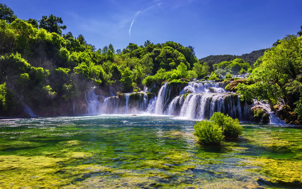 Smaragdgrüne Seen im Nationalpark Plitvicer Seen, die eindrucksvollen Felsformationen des Nationalparks Paklenica, glitzernde Wasserfälle im Krka Nationalpark, geheimnisvolle Gipfel über der tief eingeschnittenen Schlucht des Flusses Zrmanja und die wilde Natur des Naturparks Velebit – all das und noch vieles mehr erwartet Sie auf dieser Deluxe-Busreise. Diese Landschaften dienten als Kulisse für die Verfilmungen der Winnetou-Geschichten. Sie werden sich fühlen, als stünden Sie mitten in einem echten Winnetou-Abenteuer.