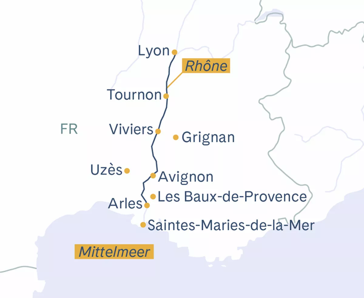 Individuelle Anreise zum Hauptbahnhof Lausanne und organisierter Bustransfer (Abfahrt um 13:30 Uhr) nach Lyon. Nach der Einschiffung und dem Kabinenbezug heisst es um 18:00 Uhr «Leinen los!». Ihre Flussreise Rhône abwärts beginnt.