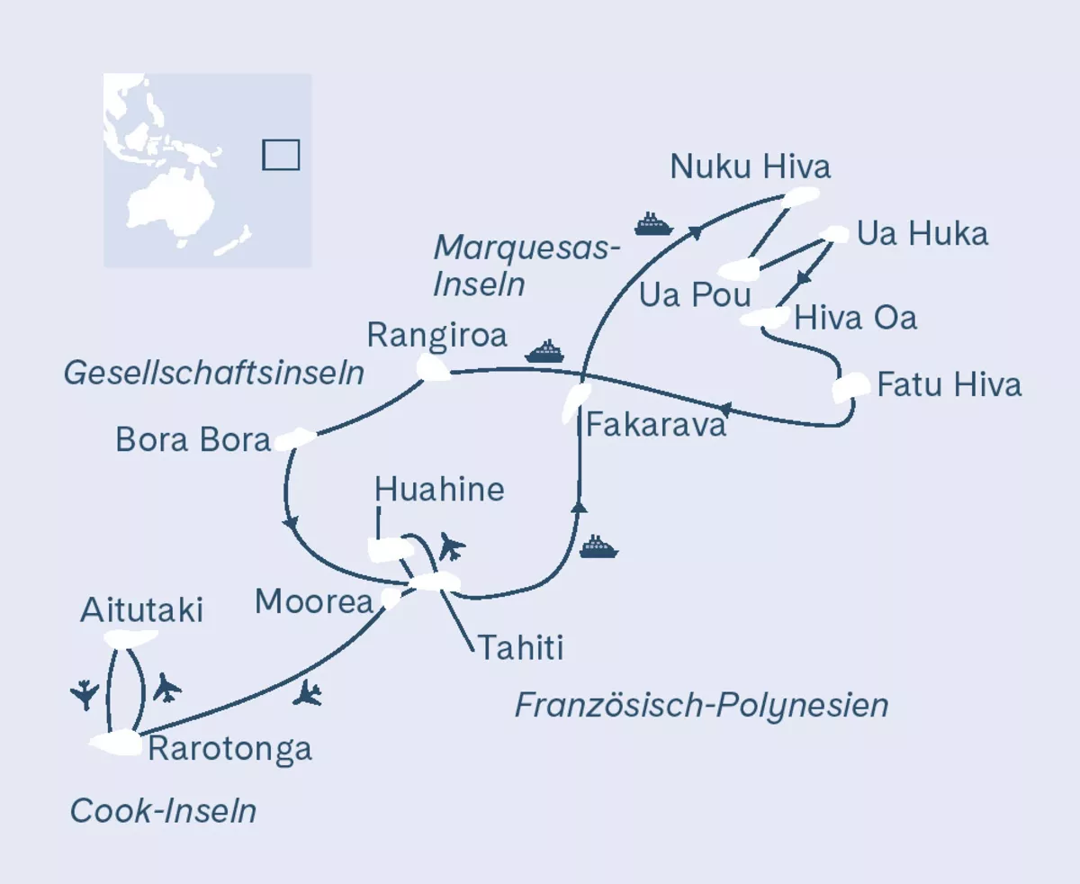 Unser Südsee-Klassiker! Freuen Sie sich auf eine unvergessliche Postschiff-Kreuzfahrt mit der Aranui 5. Das moderne Postschiff Aranui 5 versorgt auf seinen Fahrten durch die Inselwelt der Marquesas die dortigen Bewohner mit Waren und stellt so die Verbindung zum Rest der Welt dar. Kommen Sie mit an Bord und erleben Sie spannende Landausflüge, die Ihnen einzigartige Einblicke in die äusserst vielfältigen Kulturen, Künste und Bräuche der Südsee bescheren. Vulkanische Inseln, smaragdgrüne Gewässer, gewaltige Berge, spektakuläre Landschaften und stolze Kulturen erwarten Sie. Auf dieser Reise werden Sie schnell verstehen, warum Paul Gauguin und Jacques Brel die Marquesas so liebten. Sie besuchen zudem die Gesellschafts- und die Cook-Inseln und lernen so noch weitere farbenprächtige Facetten der Südsee kennen.