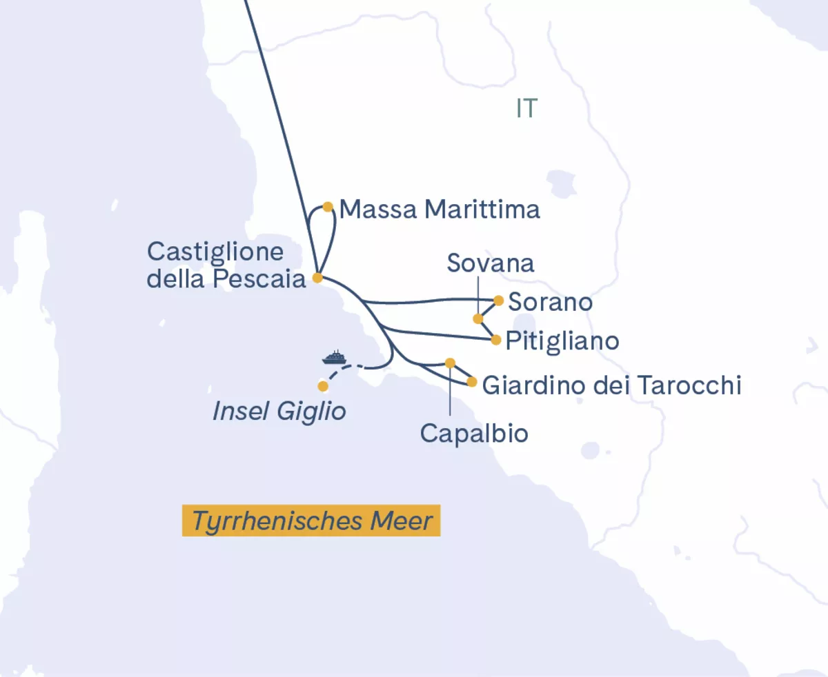 Zypressengesäumte Hügel, mittelalterliche Städtchen, wilde Küsten und der Duft von aromatischem Wein – all das prägt die Maremma, die vielleicht ursprünglichste Seele der Toskana. Freuen Sie sich auf eine Reise voller Farben, Aromen und Geschichte: Schlendern Sie durch verwinkelte Gassen, entdecken Sie ehrwürdige Burgen, erleben Sie mediterrane Inselidylle und geniessen Sie Spezialitäten wie handgemachten Pecorino, feines Olivenöl und edlen Morellino di Scansano. Willkommen in einem der authentischsten Winkel Italiens – warm, sonnig und voller Charakter.