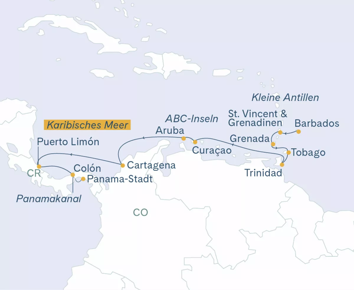 Traumhafte Ziele reihen sich auf dieser Kreuzfahrt mit der Vasco da Gama wie Perlen an einer Kette. Mit viel Zeit zum Entdecken erleben Sie zunächst die Karibik: St. Vincent und die Grenadinen, Grenada, Trinidad und Tobago, Curaçao sowie Aruba vermitteln karibisches Lebensgefühl in seiner schönsten Form – entspannt, bunt und voller sonniger Wärme. Doch damit nicht genug: Kolumbien, Costa Rica und Panama begeistern mit eindrücklicher Natur und faszinierender Kultur. In Costa Rica können Sie mit etwas Glück ein Faultier in freier Wildbahn beobachten – ein stiller Star des Regenwalds und ein besonderes Erlebnis für Naturfreunde. Die farbenfrohe, blumige Altstadt von Cartagena gehört zum UNESCO-Weltkulturerbe und lädt zum Flanieren und Staunen ein. Ein weiterer Höhepunkt dieser Reise ist die Fahrt durch den legendären Panamakanal – ein wahres Wunderwerk der Technik und Ingenieurskunst, das seit über 100 Jahren den Atlantik mit dem Pazifik verbindet. Ein Erlebnis, das man einmal im Leben gesehen haben will.