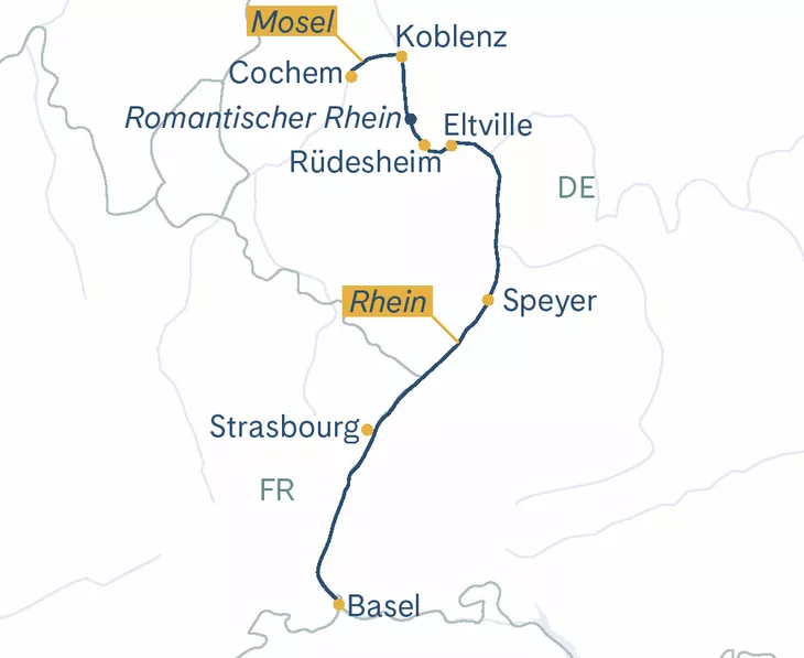Am Morgen erreichen Sie Strasbourg, die charmante Hauptstadt des Elsass. Auf dem Programm steht eine Wanderung(1) durch die malerischen Weinberge des Elsass. Unterwegs erfahren Sie Wissenswertes über den regionalen Weinbau und genießen eine Weinprobe, bei der Sie edle Tropfen aus der Region verkosten – ein genussvoller Höhepunkt inmitten einer herrlichen Landschaft. Am Nachmittag steht Ihnen Strasbourg zur freien Verfügung. Schlendern Sie durch das historische Viertel La Petite France, besuchen Sie den beeindruckenden Münsterplatz oder lassen Sie sich in einem der gemütlichen Straßencafés nieder und genießen Sie das elsässische Flair. Zurück an Bord lassen Sie den Tag bei einem stimmungsvollen Abendessen ausklingen. Währenddessen heißt es Abschied nehmen von Strasbourg, und das Schiff setzt seine Fahrt fort – auf zur letzten Etappe Ihrer Reise.