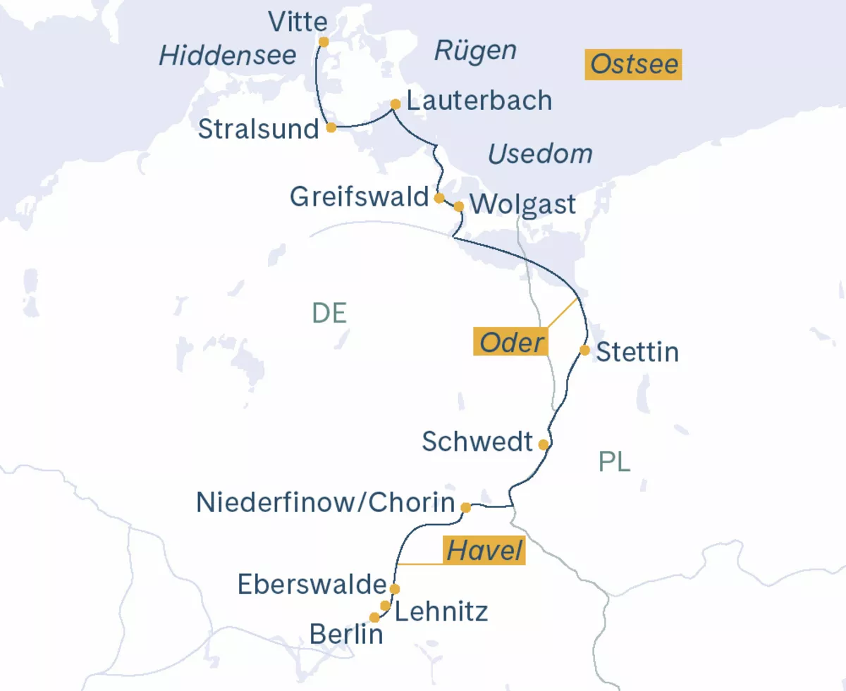 Individuelle Anreise nach Basel. Bahnfahrt mit der Gruppe im direkten ICE nach Berlin. Transfer und Einschiffung sowie Willkommens-Apéro und Abendessen. «Leinen los»! Schifffahrt auf Tegeler See, Havel und Oder-Havel-Kanal bis zu Ihrem Übernachtungsort.